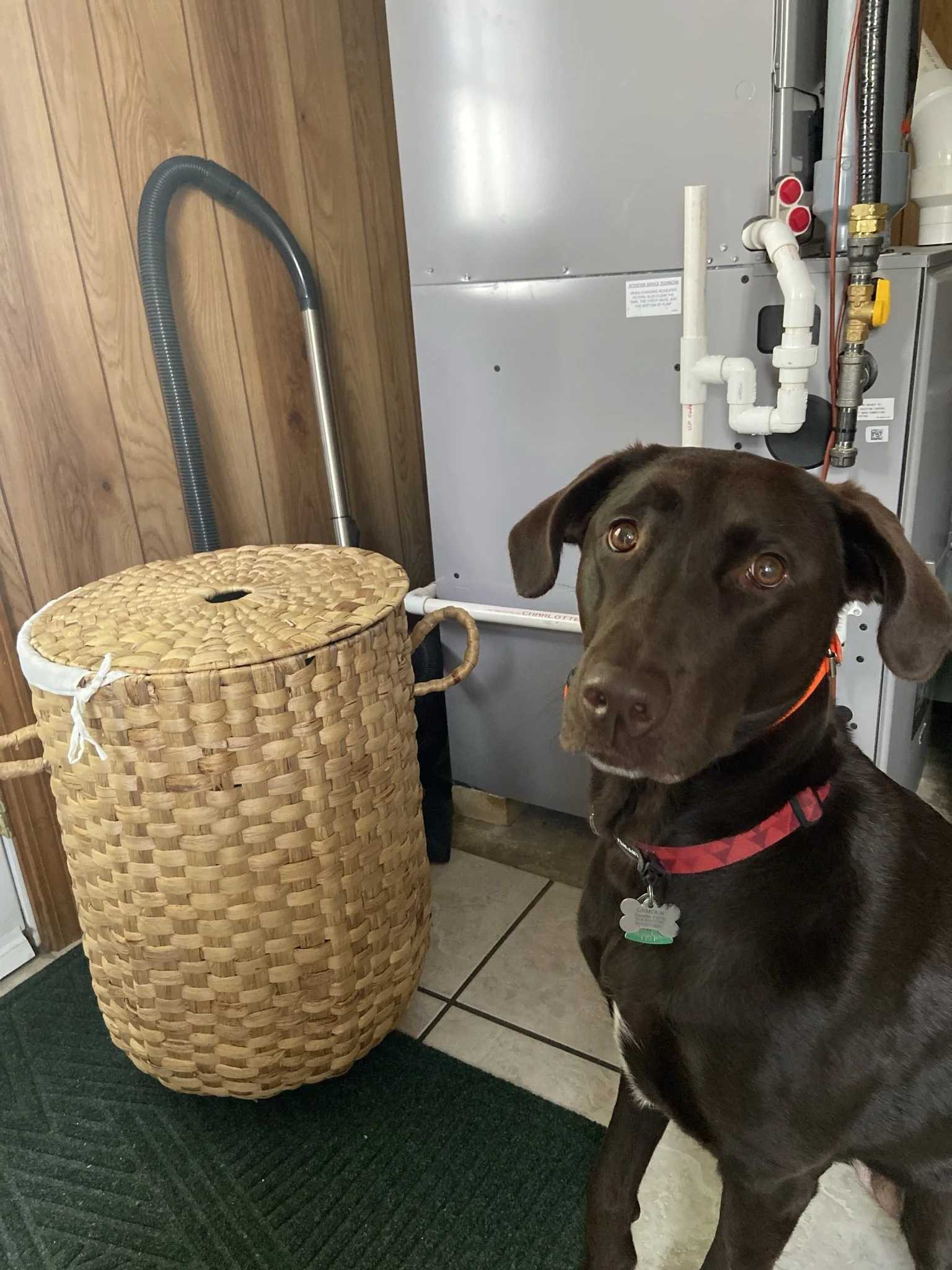 Our existing system was an old fuel oil furnace that vented through an unlined chimney. To bring it up to code we would have had to properly line the chimney, and we would be burning inefficient, expensive, not to mention dirty, fuel oil. Since our house was already equipped with a ducted system we decided to go with a new heat pump furnace. Since HVAC systems aren’t necessarily visually exciting, please enjoy this photo of my pretty laundry basket and adorable dog Camden!